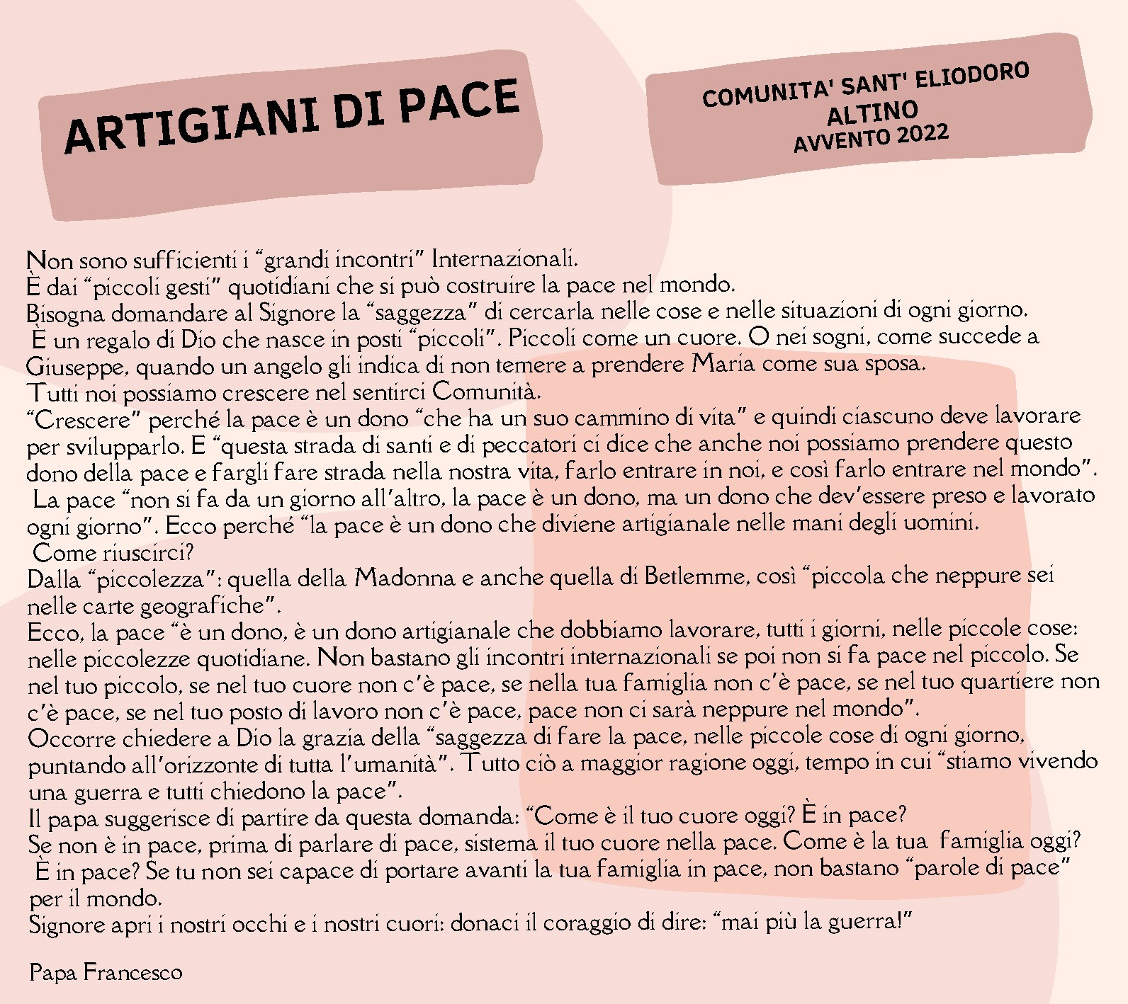 Per tutto l’Avvento la comunità di Altino si è interrogata sul tema della pace, provocata dalle parole di Papa Francesco, che risuonano forti in questo tempo di guerre e conflitti che lacerano il mondo e che chiamano in causa ciascuno ad essere artigiano di pace: