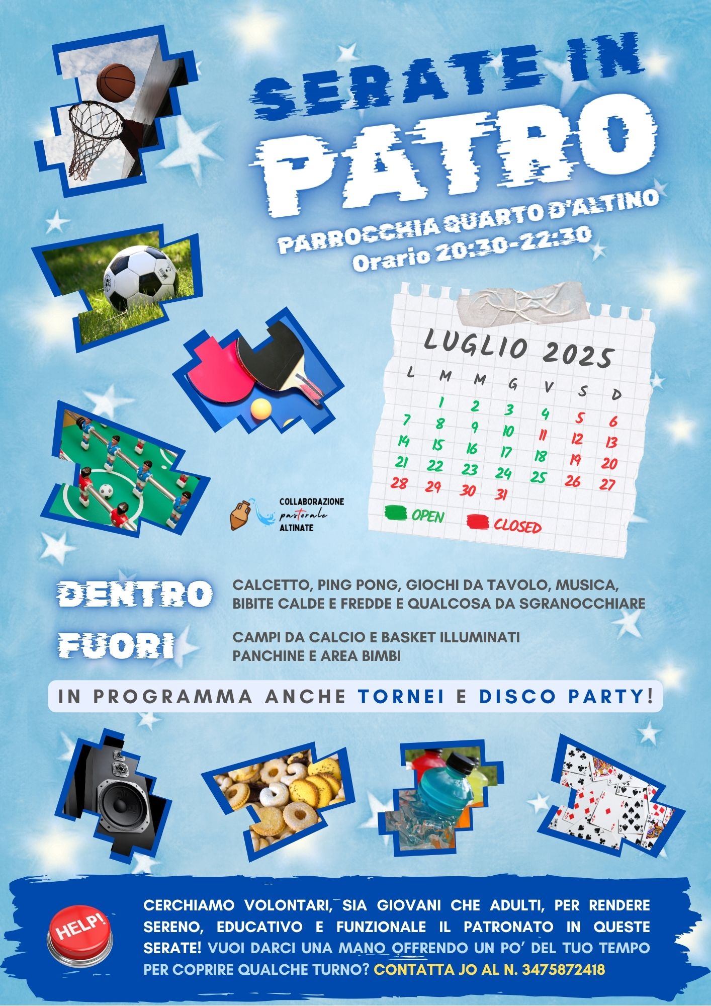 Luglio 2025 a Quarto d’Altino? Vieni a trascorrere le serate in patro! Nei giorni feriali il patronato di Quarto d’Altino apre le porte a tutti dopocena con tanti giochi e serate speciali, dalle 20:30 alle 22:30 tanto spazio per il divertimento e l’amicizia.
